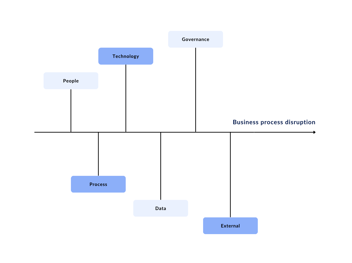 Typical categories: Process, People, Technology/Applications, Data, Infrastructure, Policy/Governance, External/Regulatory.